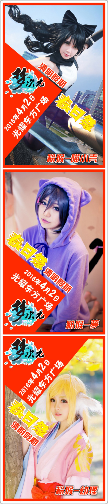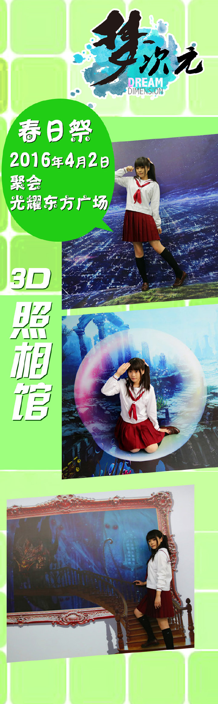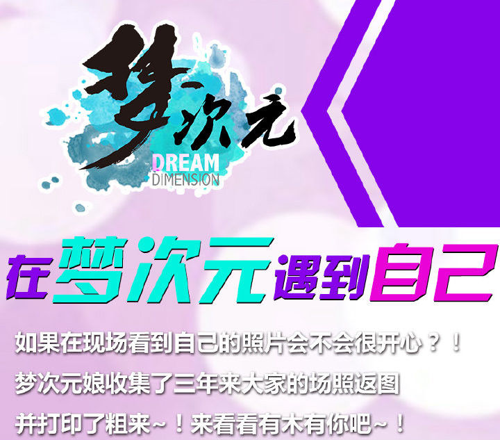 七、在梦次元遇到自己:如果在现场看到自己的照片会不会很开心?!梦次元娘收集了三年来大家的场照返图并打印了粗来~!来看看有木有你吧~!(感谢大家陪伴我们这么久!也向我们犯的两次蠢而无心伤害的小伙伴们致歉QAQ非常对不起)只要关注梦次元娘然后发微博话题#在梦次元遇到自己#就可以带走照片哟~! 八:原创画手交流区:不管是是画手大大还是小透明,只要有爱都欢迎一起来涂涂画画!梦次元现场举办#梦次元娘你猴!#猴年绘画大赛!画出你中的梦次元娘~!人气最高的三名触手大大还有奖金和礼品哟! ⑨:3D画像馆:场馆自带3D画像馆!就是这么任性(ノω<。)ノ))☆.。~!凭漫展门票还有优惠呢~!