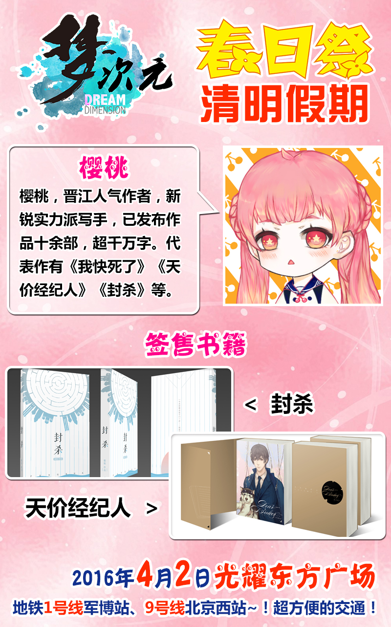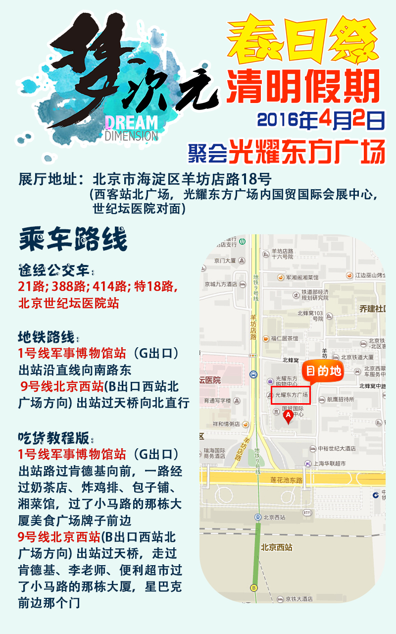 时间:2016年4月2日 清明假假期(◡ᴗ◡✿)早9:00-下午4:00 (北京市海淀区羊坊店18号,西客站北广场,世纪坛医院对面) 地铁路线: 1号线军事博物馆站(G出口)出站沿直线向南路东 &9号线北京西站(B出口西站北广场方向) 出站过天桥向北直行 现场票价:45元/张 (前500有ACTOYS提供的节操小礼袋一份) 一、原创同人&BJD交流区:用心绘制的漫画和认真付梓的小说,各种原创设计的配套周边,酷爱来找你喜欢的触触现场求签名求签绘求GD不要放过TA!还有bjd同好交流贩售区,爹妈们快来买买买!过年之前不来给闺女儿砸挑挑衣服鞋子配饰道具嘛( ゚∀゚) ノ♡~ 二、动漫周边区:囊括方方面面,保证一次采购到爽~卡贴海报鼠标垫,手办毛绒眼镜布,绅士的软妹抱枕、腐女的CP套件;Coser的假毛服饰、同袍的璎珞发簪、lo娘的饰品小物、基佬的项圈小皮鞭(大雾)……钱包哭了?嗯, 转账付费也是可以哒<( ̄3 ̄)>! 三、名C签售区:众多人气coser等你来合影签名,不再隔着屏幕,现场告诉TA大大我要给你生猴子!(当然还请理智参与签售活动,听从现场工作人员安排及遵守相关礼仪,违者会被集体扛出去抽(调)打(教)的(*/ω╲*))。